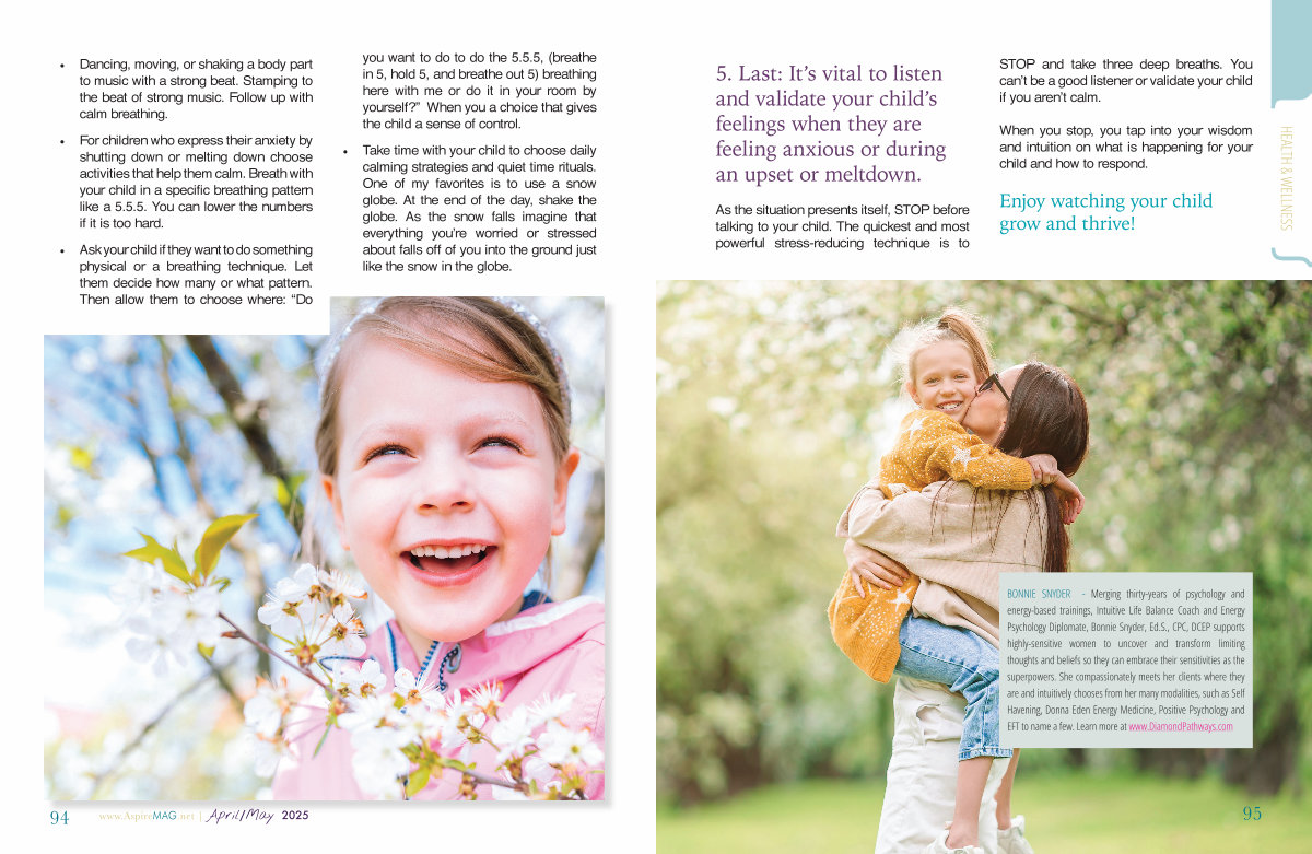 BONNIE SNYDER- Merging thirty-years of psychology and energy-based trainings, Intuitive Life Balance Coach and Energy Psychology Diplomate, Bonnie Snyder, Ed. S., CPC, DCEP supports highly-sensitive women to uncover and transform limiting thoughts and beliefs so they can embrace their sensitivities as the superpowers. She compassionately meets her clients where they are and intuitively chooses from her many modalities, such as Self Havening, Donna Eden Energy Medicine, Positive Psychology and EFT to name a few. Learn more at www. DiamondPathways. com