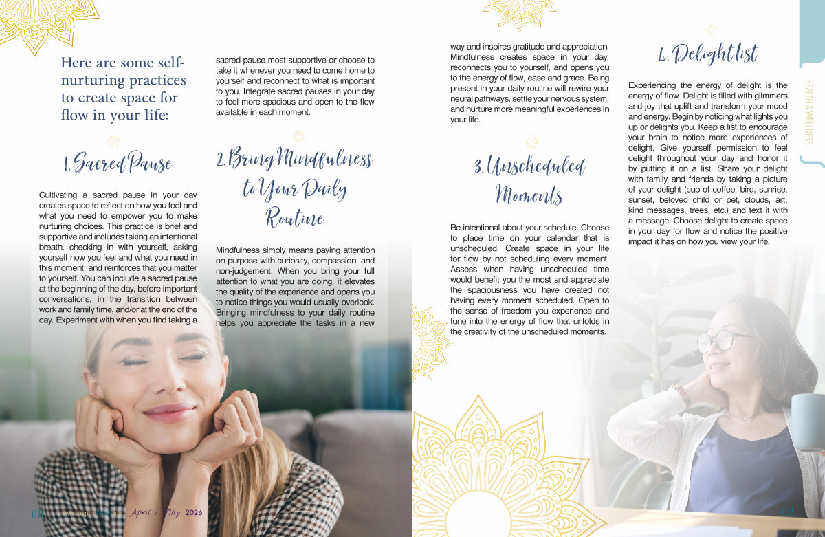 way and inspires gratitude and appreciation. Mindfulness creates space in your day, reconnects you to yourself, and opens you to the energy of flow, ease and grace. Being present in your daily routine will rewire your neural pathways, settle your nervous system, and nurture more meaningful experiences in your life.