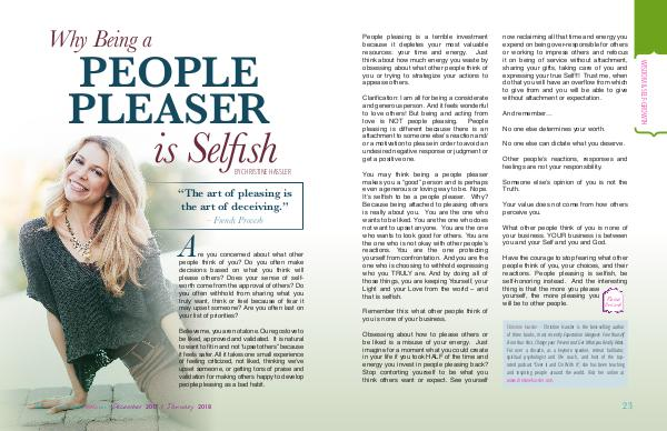You may think being a people pleaser makes you a“ good” person and is perhaps even a generous or loving way to be. Nope. It’ s selfish to be a people pleaser. Why? Because being attached to pleasing others is really about you. You are the one who wants to be liked. You are the one who does not want to upset anyone. You are the one who wants to look good for others. You are the one who is not okay with other people’ s reactions. You are the one protecting yourself from confrontation. And you are the one who is choosing to withhold expressing who you TRULY are. And by doing all of those things, you are keeping Yourself, your Light and your Love from the world – and that is selfish.