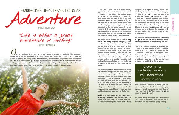 And I love that there are so many selfnurturing aspects of adventure! To begin with, breaking out of our everyday routines and looking at our lives from a fresh perspective bring new energy, ideas, and creativity. Living adventurously and stepping outside of our comfort zones encourage us to truly learn about ourselves and nurture our growth and potential. Reframing a transition into an adventure allows us to feel like we have influence on the trajectory of our lives rather than feeling like life happens to us. Choosing to see transitions as adventures enables us to embrace life changes with curiosity rather than getting stuck in fear and judgment.