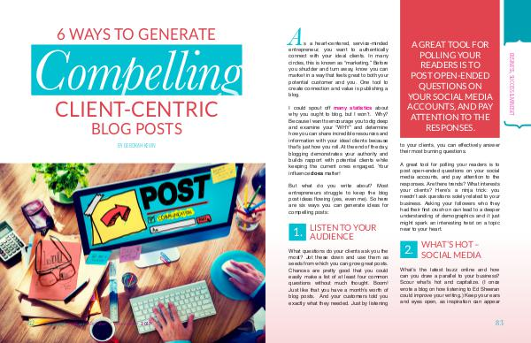 6 WAYS TO GENERATE Compelling CLIENT-CENTRIC BLOG POSTS BY DEBORAH KEVIN 82 www.AspireMAG.net | October / November 2017