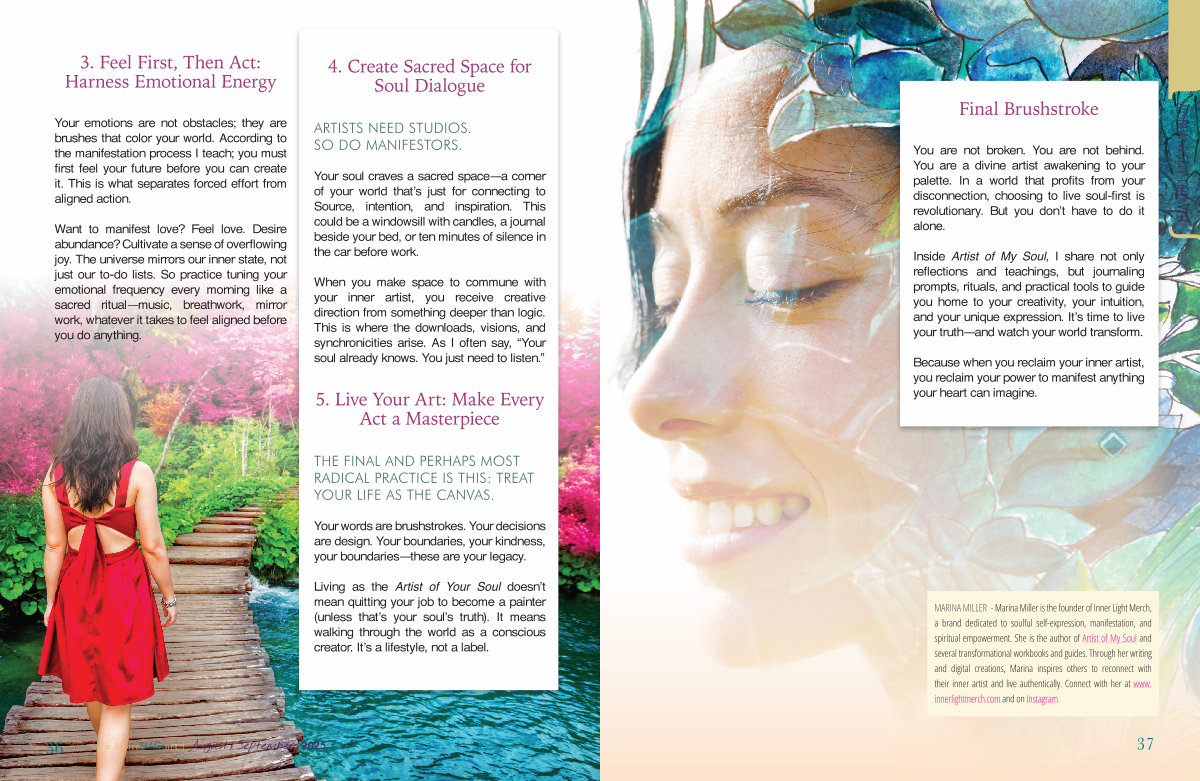 MARINA MILLER- Marina Miller is the founder of Inner Light Merch, a brand dedicated to soulful self-expression, manifestation, and spiritual empowerment. She is the author of Artist of My Soul and several transformational workbooks and guides. Through her writing and digital creations, Marina inspires others to reconnect with their inner artist and live authentically. Connect with her at www. innerlightmerch. com and on Instagram.