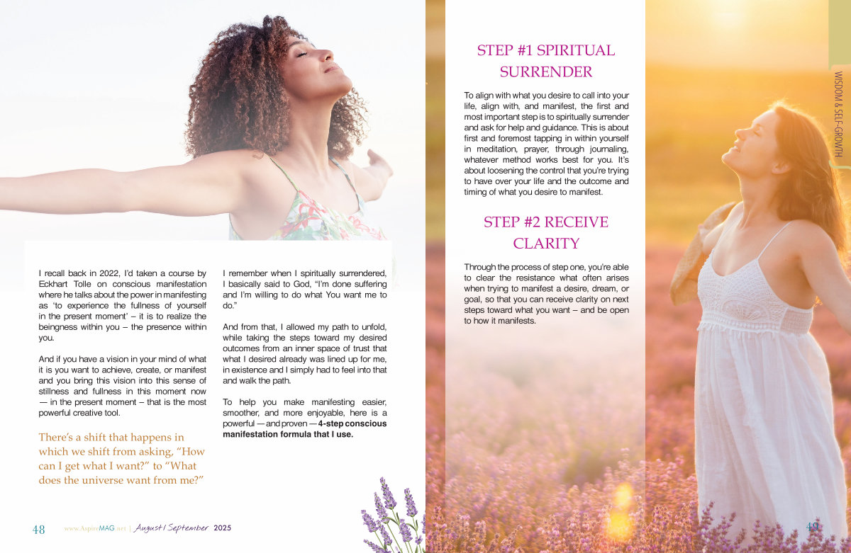 To align with what you desire to call into your life, align with, and manifest, the first and most important step is to spiritually surrender and ask for help and guidance. This is about first and foremost tapping in within yourself in meditation, prayer, through journaling, whatever method works best for you. It’ s about loosening the control that you’ re trying to have over your life and the outcome and timing of what you desire to manifest.