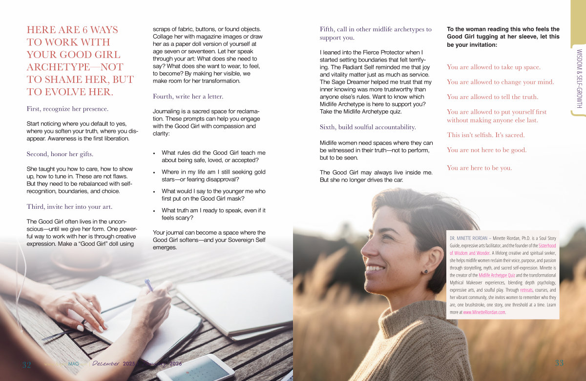DR. MINETTE RIORDAN – Minette Riordan, Ph. D. is a Soul Story Guide, expressive arts facilitator, and the founder of the Sisterhood of Wisdom and Wonder. A lifelong creative and spiritual seeker, she helps midlife women reclaim their voice, purpose, and passion through storytelling, myth, and sacred self-expression. Minette is the creator of the Midlife Archetype Quiz and the transformational Mythical Makeover experiences, blending depth psychology, expressive arts, and soulful play. Through retreats, courses, and her vibrant community, she invites women to remember who they are, one brushstroke, one story, one threshold at a time. Learn more at www. MinetteRiordan. com.