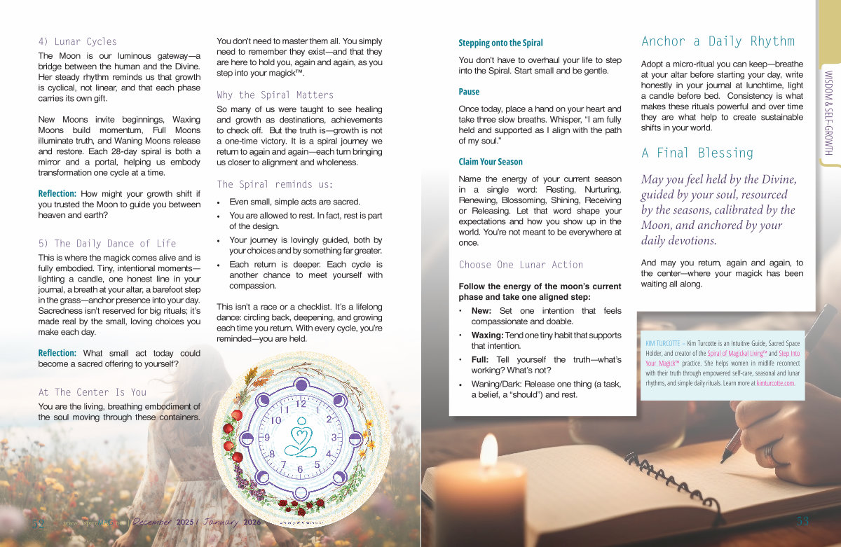 KIM TURCOTTE – Kim Turcotte is an Intuitive Guide, Sacred Space Holder, and creator of the Spiral of Magickal Living™ and Step Into Your Magick™ practice. She helps women in midlife reconnect with their truth through empowered self-care, seasonal and lunar rhythms, and simple daily rituals. Learn more at kimturcotte. com.