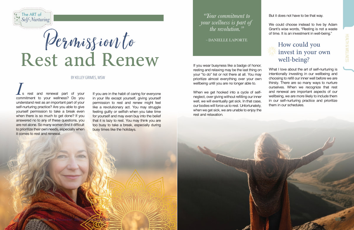 Is rest and renewal part of your commitment to your wellness? Do you understand rest as an important part of your self-nurturing practice? Are you able to give yourself permission to take a break even when there is so much to get done? If you answered no to any of these questions, you are not alone. So many women find it difficult to prioritize their own needs, especially when it comes to rest and renewal.