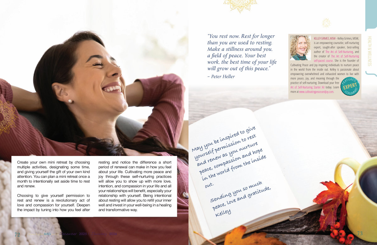 KELLEY GRIMES, MSW- Kelley Grimes, MSW, is an empowering counselor, self-nurturing expert, sought-after speaker, best-selling author of The Art of Self-Nurturing, and the creator of The Art of Self-Nurturing self-paced course. She is the founder of Cultivating Peace and Joy inspiring individuals to nurture peace in the world from the inside out. Kelley is passionate about empowering overwhelmed and exhausted women to live with more peace, joy, and meaning through the practice of self-nurturing. Download your free Art of Self-Nurturing Starter Kit today. Learn more at www. cultivatingpeaceandjoy. com.