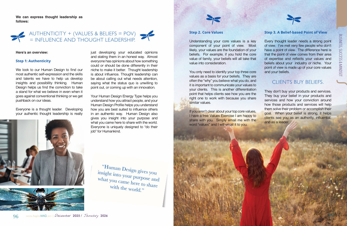 We look to our Human Design to find our most authentic self-expression and the skills and talents we have to help us develop insights and possibility thinking. Human Design helps us find the conviction to take a stand for what we believe in even when it goes against conventional thinking or we get pushback on our ideas.