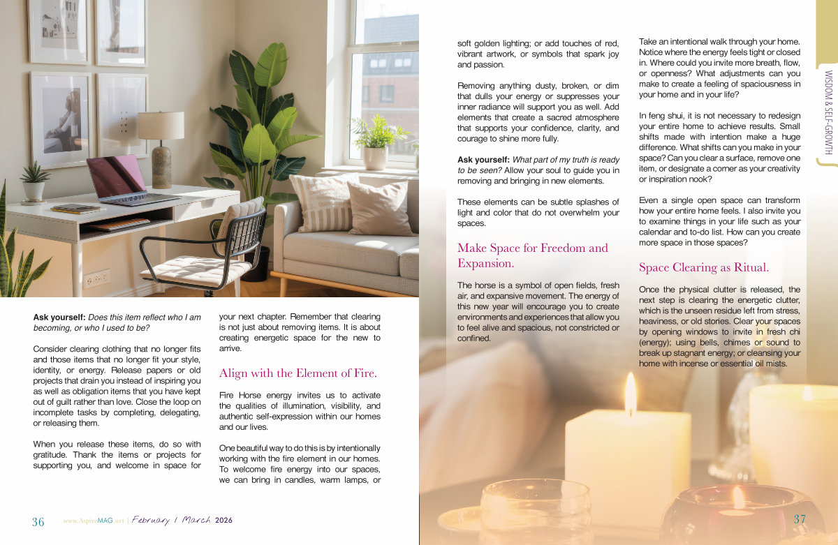 Take an intentional walk through your home. Notice where the energy feels tight or closed in. Where could you invite more breath, flow, or openness? What adjustments can you make to create a feeling of spaciousness in your home and in your life?