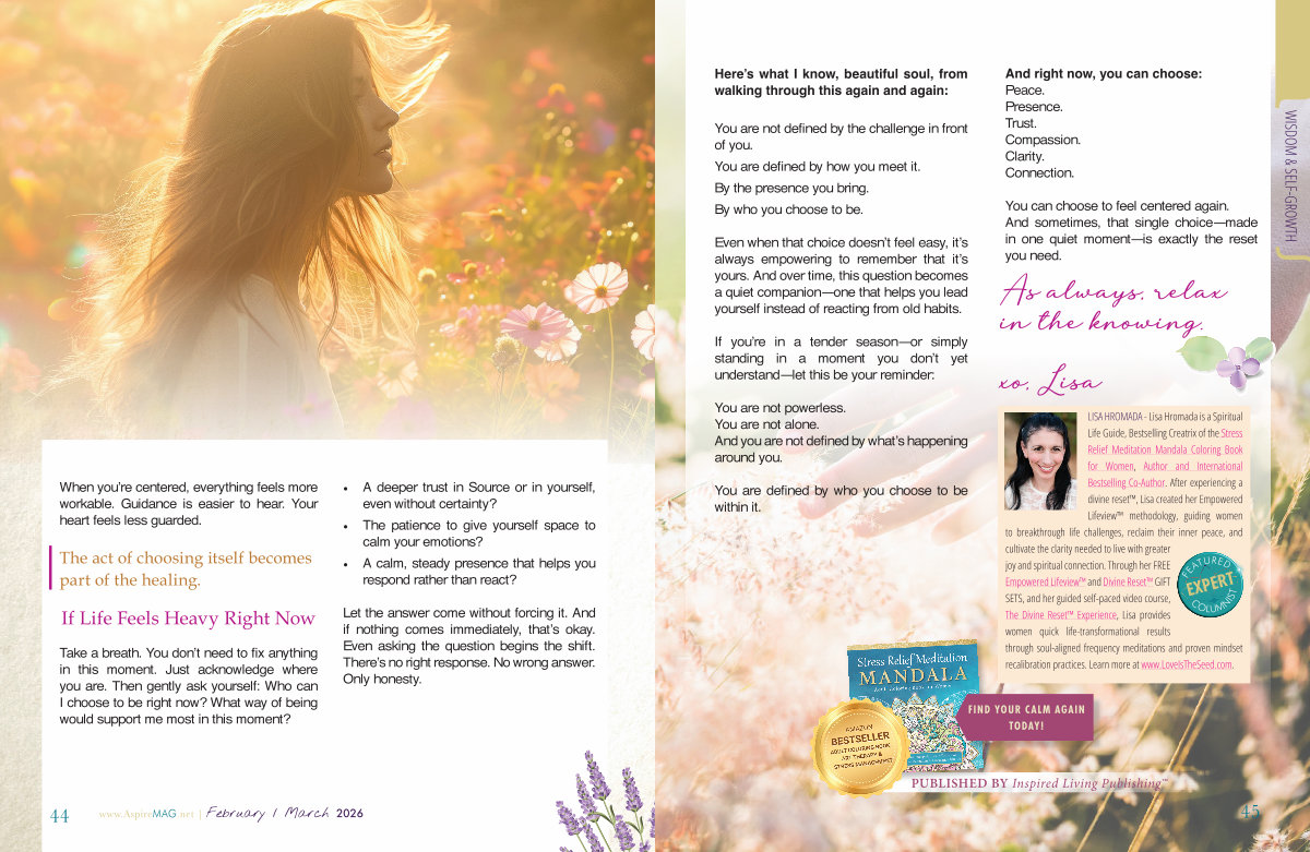 LISA HROMADA- Lisa Hromada is a Spiritual Life Guide, Bestselling Creatrix of the Stress Relief Meditation Mandala Coloring Book for Women, Author and International Bestselling Co-Author. After experiencing a divine reset™, Lisa created her Empowered Lifeview™ methodology, guiding women to breakthrough life challenges, reclaim their inner peace, and cultivate the clarity needed to live with greater joy and spiritual connection. Through her FREE Empowered Lifeview™ and Divine Reset™ GIFT SETS, and her guided self-paced video course, The Divine Reset™ Experience, Lisa provides women quick life-transformational results