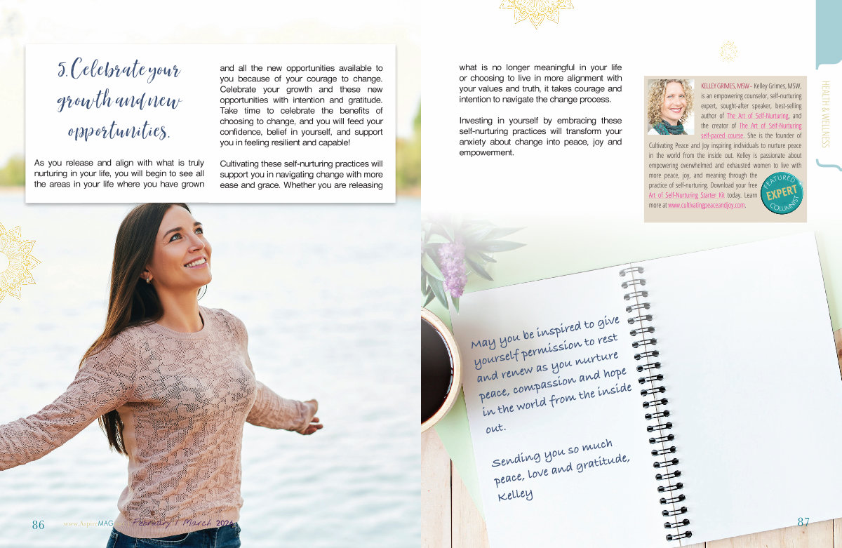 KELLEY GRIMES, MSW- Kelley Grimes, MSW, is an empowering counselor, self-nurturing expert, sought-after speaker, best-selling author of The Art of Self-Nurturing, and the creator of The Art of Self-Nurturing self-paced course. She is the founder of Cultivating Peace and Joy inspiring individuals to nurture peace in the world from the inside out. Kelley is passionate about empowering overwhelmed and exhausted women to live with more peace, joy, and meaning through the practice of self-nurturing. Download your free Art of Self-Nurturing Starter Kit today. Learn more at www. cultivatingpeaceandjoy. com.