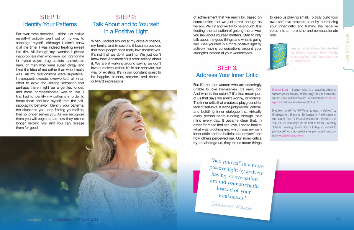 For over three decades, I didn’ t just dislike myself— I actively went out of my way to sabotage myself. Although I didn’ t know it at the time, I was indeed treating myself like dirt. All through my twenties I picked inappropriate men who were not right for me in myriad ways: drug addicts, unavailable men, or men who were super clingy and liked the idea of me rather than who I really was. All my relationships were superficial. I overspent, overate, overworked, all in an effort to avoid the sinking sensation that perhaps there might be a gentler, kinder, and more compassionate way to live. I first had to identify my patterns in order to break them and free myself from the selfsabotaging behavior. Identify your patterns, the situations you keep finding yourself in, that no longer serves you. As you recognize them you will begin to see how they are no longer helping you and you can release them for good.