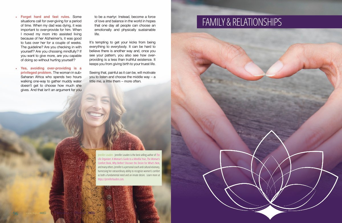 • Forget hard and fast rules. Some situations call for over-giving for a period of time. When my dad was dying, it was important to over-provide for him. When I moved my mom into assisted living because of her Alzheimer’ s, it was good to fuss over her for a couple of weeks. The guideline? Are you checking in with yourself? Are you choosing mindfully? If you want to give more, are you capable of doing so without hurting yourself?