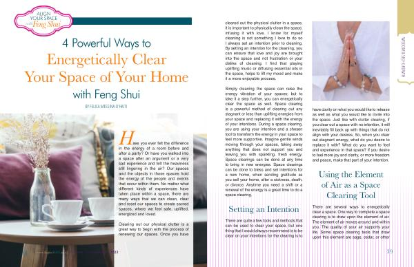 Simply cleaning the space can raise the energy vibration of your spaces ; but to take it a step further , you can energetically clear the space as well . Space clearing is a powerful method of clearing out any stagnant or less than uplifting energies from your space and replacing it with the energy of your intentions . During a space clearing , you are using your intention and a chosen tool to transform the energy in your space to feel more supportive . Imagine gentle winds moving through your spaces , taking away anything that does not support you and leaving you with sparkling , fresh energy . Space clearings can be done at any time to bring in new energies . Space clearings can be done to bless and set intentions for a new home , when sending gratitude as you sell your home , after a sickness , death , or divorce . Anytime you need a shift or a renewal of the energy is a great time to do a space clearing .