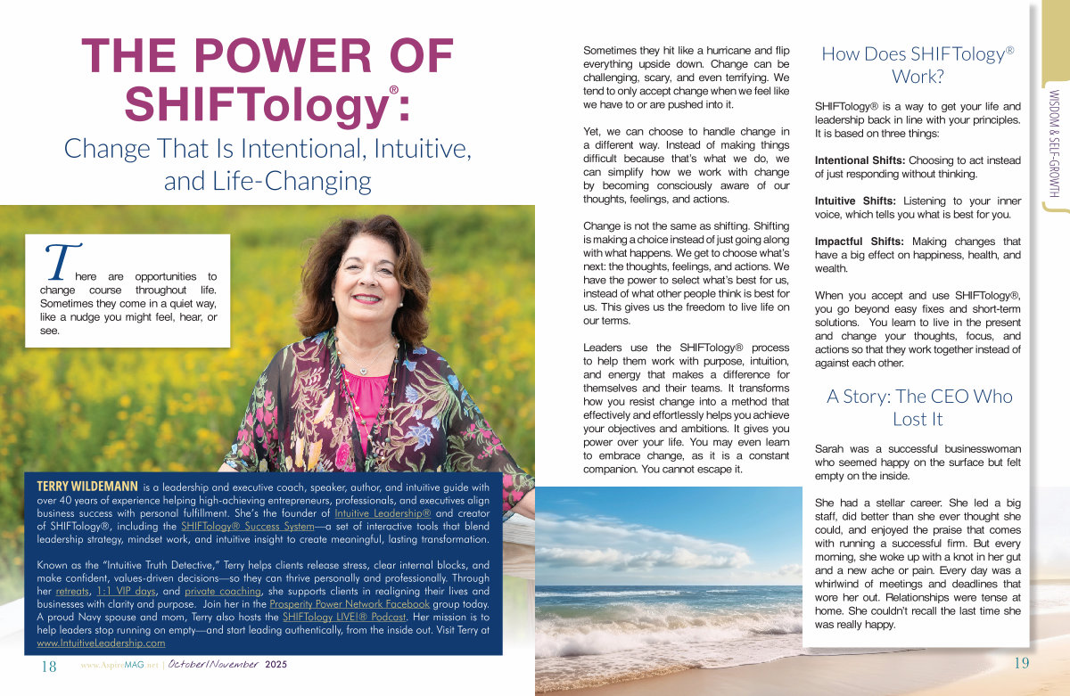 TERRY WILDEMANN is a leadership and executive coach, speaker, author, and intuitive guide with over 40 years of experience helping high-achieving entrepreneurs, professionals, and executives align business success with personal fulfillment. She’ s the founder of Intuitive Leadership ® and creator of SHIFTology ®, including the SHIFTology ® Success System— a set of interactive tools that blend leadership strategy, mindset work, and intuitive insight to create meaningful, lasting transformation.