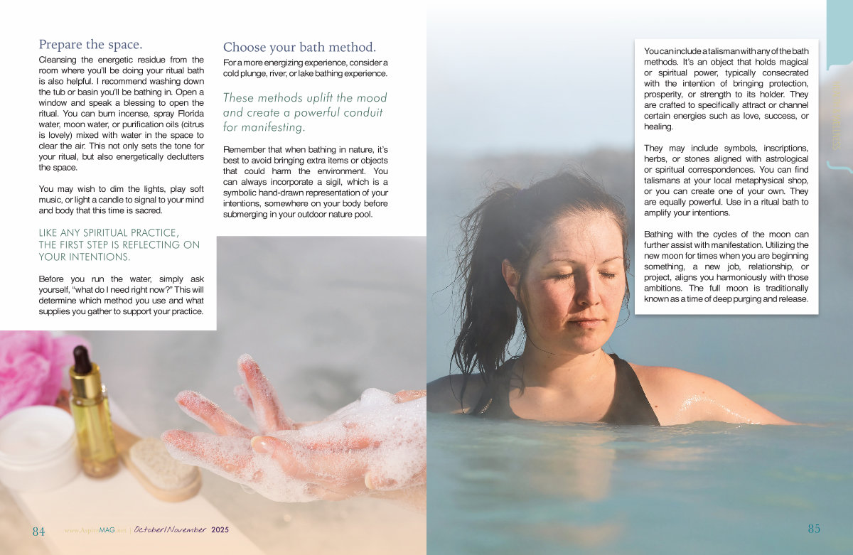 Bathing with the cycles of the moon can further assist with manifestation. Utilizing the new moon for times when you are beginning something, a new job, relationship, or project, aligns you harmoniously with those ambitions. The full moon is traditionally known as a time of deep purging and release.